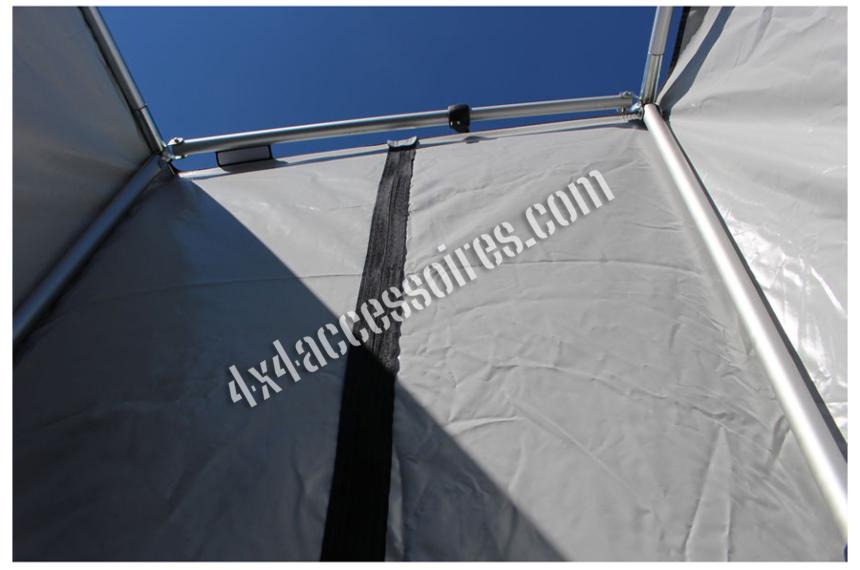 - Fixée sur un cadre dans sa partie haute et elle peut, si nécessaire, être attachée au sol avec des piquets