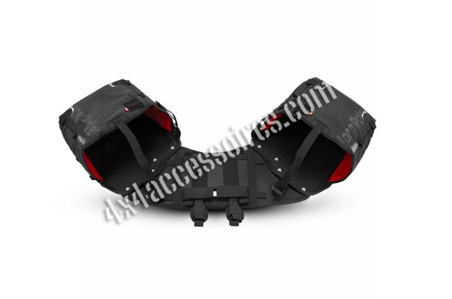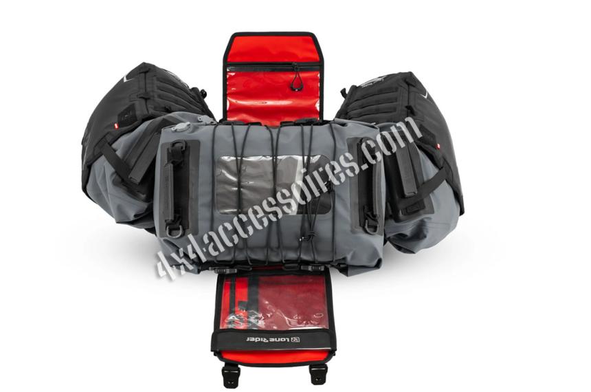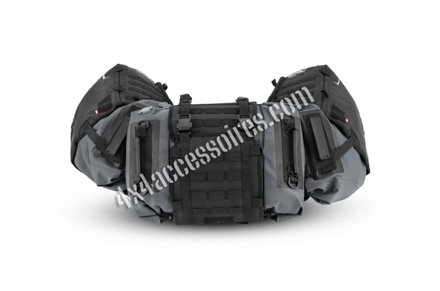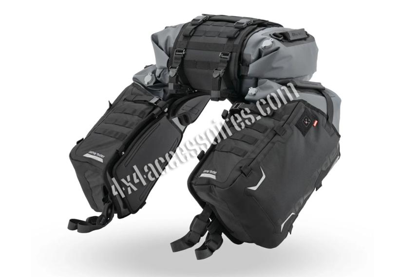 Chaque sac latéral possède une fermeture Super Seal qui empêche la poussière et l’eau de pénétrer, même lorsqu’elle est mal roulée. Des valves facilitent la compression, et une sangle permet de bien insérer les sacs dans les holsters. Les boucles magnétiques assurent une fermeture rapide et facile avec des gants, tandis que les poignées intégrées rendent le transport pratique. Une fenêtre transparente sur chaque sac permet de visualiser rapidement son contenu sans avoir à tout déballer.