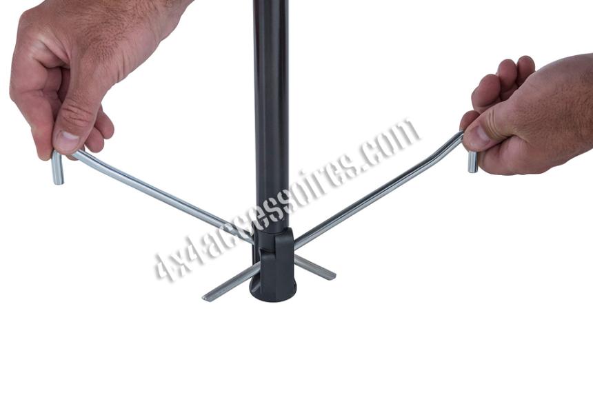 Si vous risquez du vent, il est nécessaire de bien respecter la séquence de montage. Dans des conditions ventées, il est nécessaire d'être deux pour le montage: une personne doit maintenir le bras pendant que l'autre met en place les piquets et cordages.
