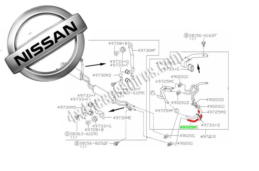Réf. 49725-VC504Durite de radiateur de direction assistée pour Nissan Patrol Y61 2.8L TD6 et 3.0L avant 10/2005
