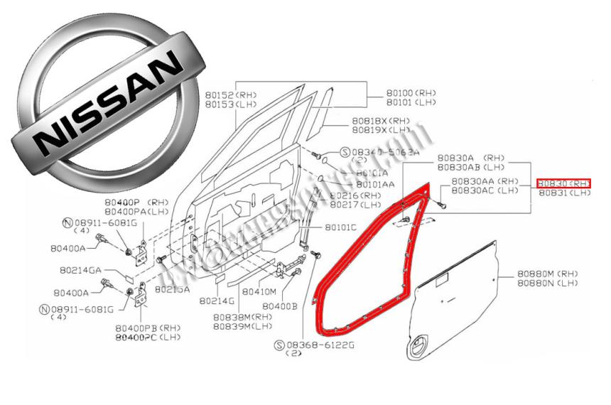 Réf. 80830-VB000 - 80830-VB001 - 80830-VB002Joint de porte avant droit pour Nissan Patrol Gr Y61 avant octobre 2005