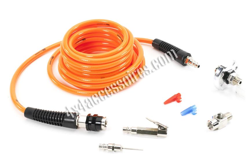 Livré avec tuyau d’air de 6 mètres et les raccords nécessaires pour gonfler différents types de pneumatiques.