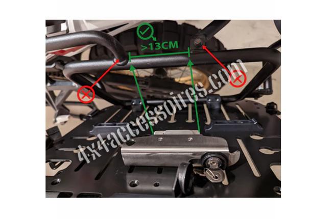 Le loquet de verrouillage a besoin d'un espace minimum de 13 cm sur le porte-bagages pour pouvoir se fermer, comme illustré sur la photo ci-contre. Le loquet de verrouillage peut être déplacé et le système de libération rapide peut être ajusté pour s'adapter à des supports de différentes tailles, l'ajustement est fortement recommandé pour un positionnement optimal.