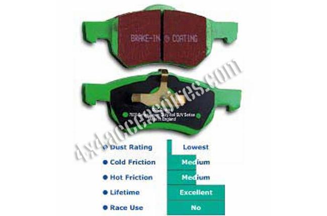 Les plaquettes Greenstuff offrent une excellente solution pour les 4x4. Leur formulation robuste possède un coefficient de friction de 0.45 et reste efficace jusqu'à 450°C, mais elle offre l'avantage de faire durer les plaquettes plus longtemps et de les rendre plus résistantes dans des conditions de conduite hors piste, sur terrain poussièreux, sablonneux,ect...