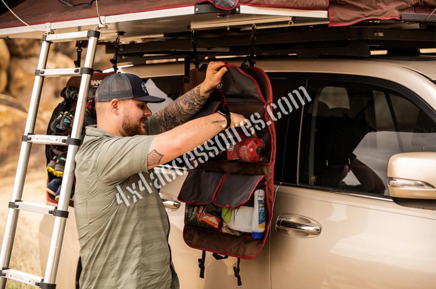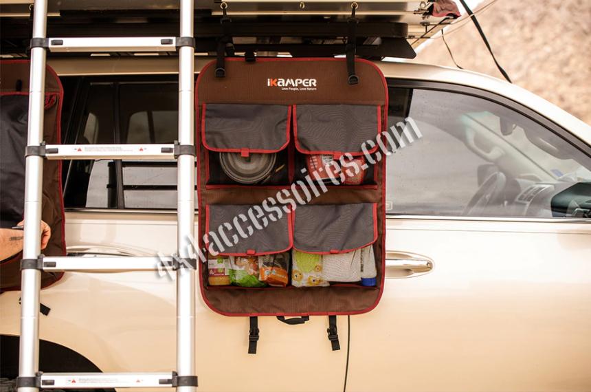 Installez ce rangement sur le coté de votre tente de toit et rangez vos affaires de camping facilement.