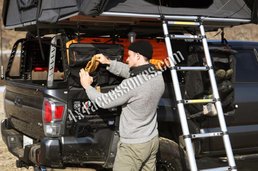 Réf. BC007-001Installez ce rangement sur le coté de votre tente de toit et rangez vos affaires de camping facilement.