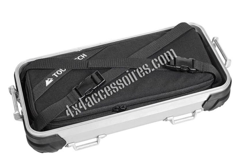 Renforcée sur le dessus et le dessous avec une mousse de 7 mm, cette sacoche s'attache directement dans le couvercle du coffre ZEGA Evo au moyen de deux courroies.