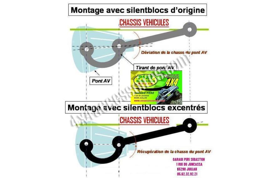 Pour compenser ce phénomène et retrouver un équilibre et une précision de conduite équivalente à l'origine, il suffit de remplacer les silentblocs des tirants de pont avant par des modèles avec axe excentré.