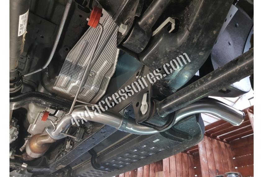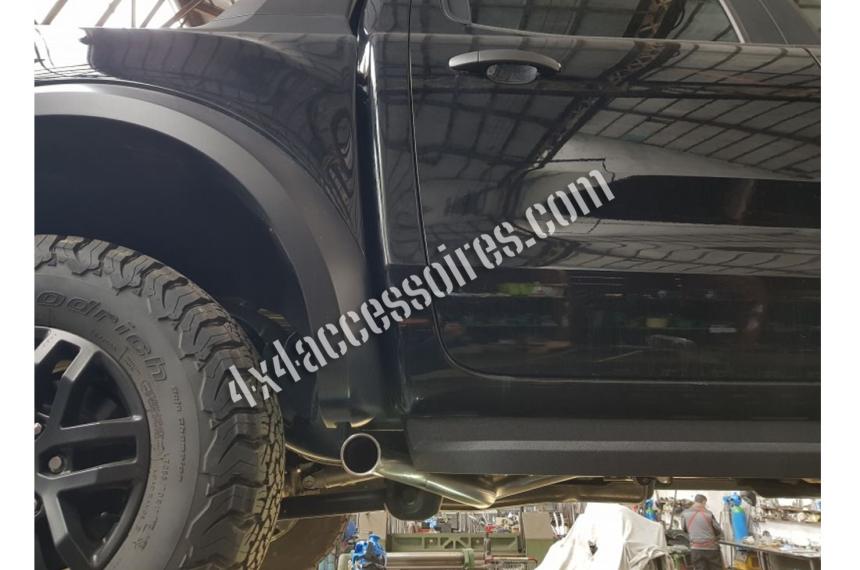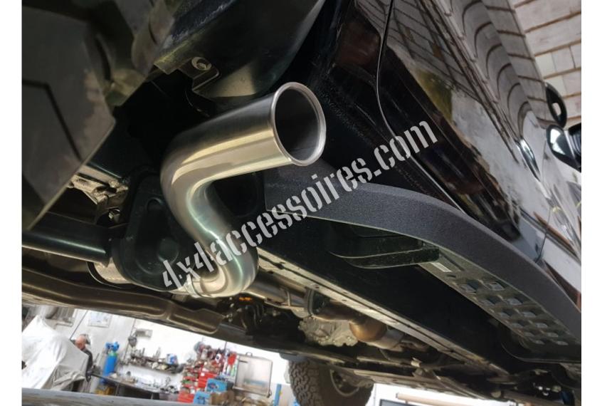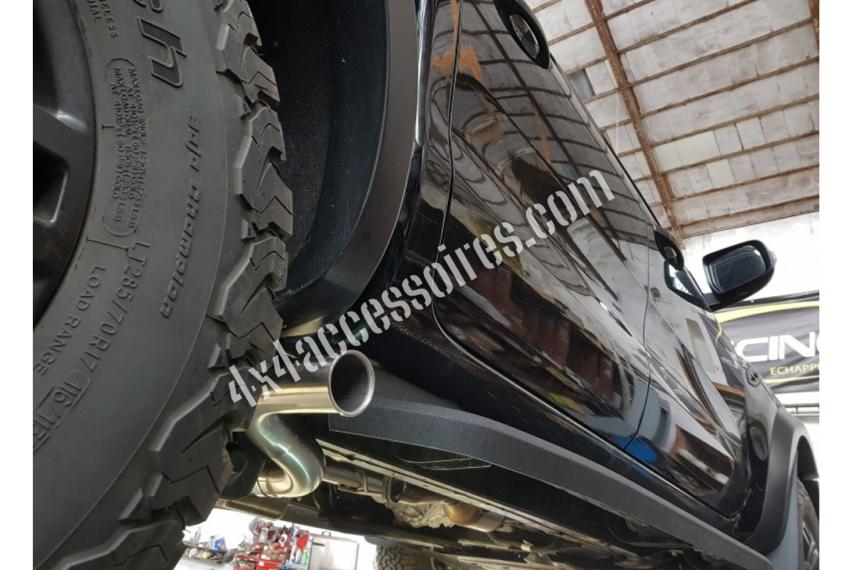 Sa conception innovante permet un montage avec ou sans marche pieds. Nous avons développé cette pièce avec pour objectif de libérer de la place sous le véhicule et d'augmenter la garde au sol. Le niveau sonore ne change pas ou pratiquement pas et le fait d'avoir supprimé le silencieux central permet au moteur de respirer plus librement. Notre sortie latérale reprend les points d'ancrages de l'échappement d'origine ce qui rend le montage extrèmement aisé.