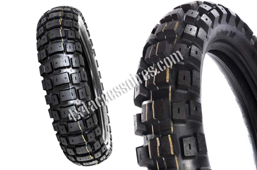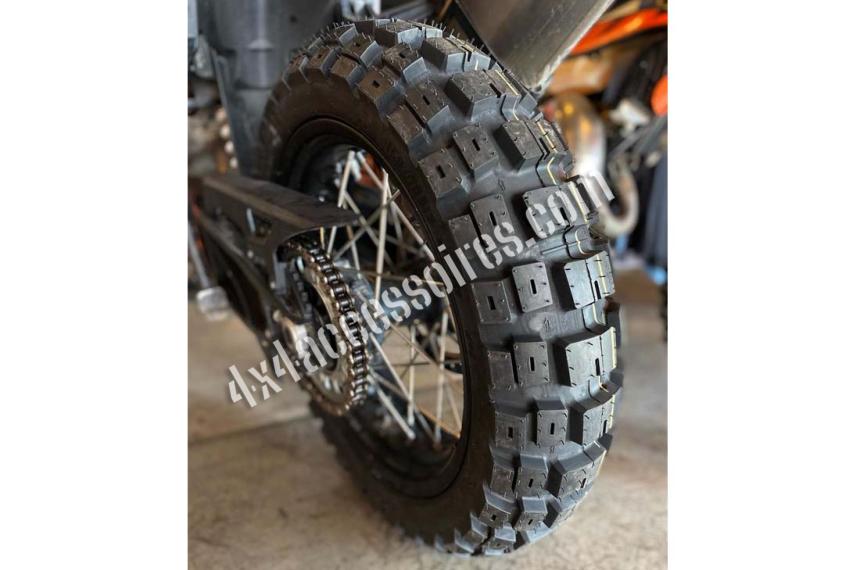 Son profil est à la fois un pneu de course du désert et un pneu d'aventure longue distance.